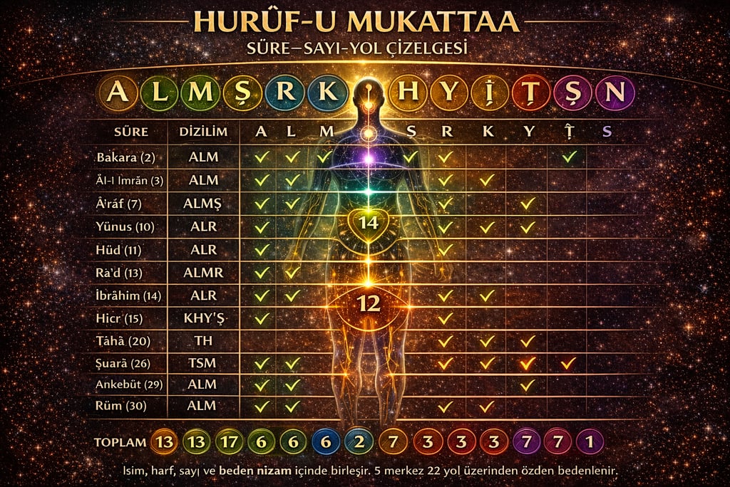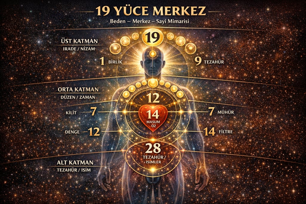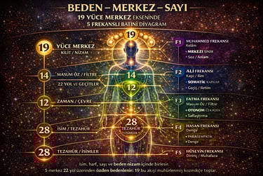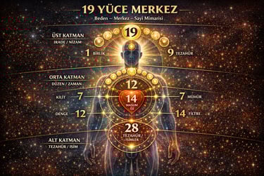 19 YÜCE MERKEZ EKSENİ-1. 5 MERKEZ FREKANSI ve 22 YOLUN BATINÎ MİMARİSİ BEDEN – MERKEZ – SAYI Ebced – Gematria – Sinir Sistemi Karşılaştırmalı Okuma Bu poster, batınî gelenekte tekrar eden 19, 14, 12, 22 ve 28 sayılarının; insan bedeni, sinir sistemi, yaratım dili (harf–sayı) ve Tevrat–Kur’an ortak..