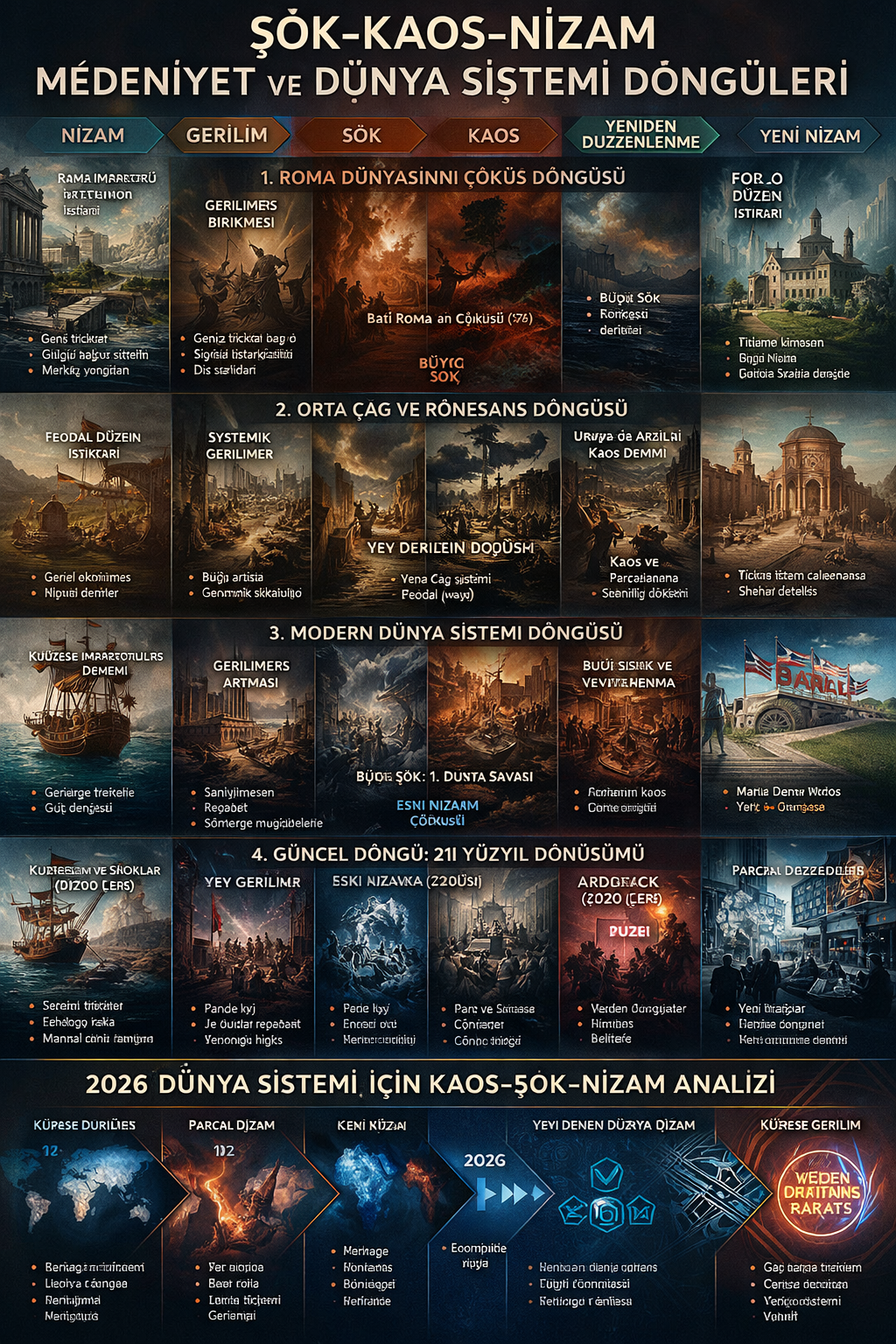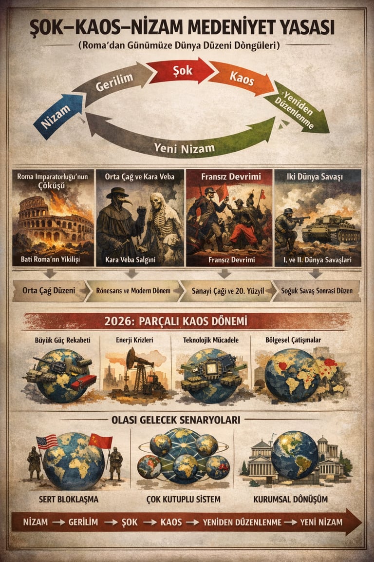Dünya tarihine geniş ölçekte bakıldığında medeniyetlerin ve küresel düzenlerin rastgele değil döngüsel dönüşümlerle değiştiği görülür. Bu dönüşümler çoğu zaman büyük şokların tetiklediği kaos dönemleri ve ardından gelen yeni düzenlerle ortaya çıkar.