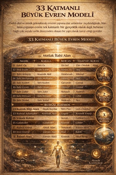 Farklı dinî ve mistik geleneklerde evrenin yapısına dair anlatımlar incelendiğinde, bunların çoğunun evreni tek katmanlı bir gerçeklik olarak değil, birbirine bağlı çok sayıda varlık düzeyinden oluşan bir yapı olarak tasvir ettiği görülür. İslam tasavvufu, Yahudi mistisizmi (Kabala), Vedik metafizik ve modern ezoterik yorumlarda bu çok katmanlı evren fikri farklı sembollerle ifade edilmiştir. Bu yaklaşımlar karşılaştırıldığında, yorumlayıcı bir sentez olarak 33 katmanlı bir kozmoloji modeli ortaya konabilir. Bu model tek bir dinin öğretisi değildir; farklı geleneklerdeki metafizik kavramların karşılaştırılmasından elde edilen bir düşünsel haritadır.
