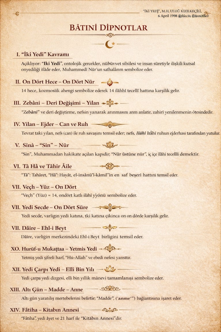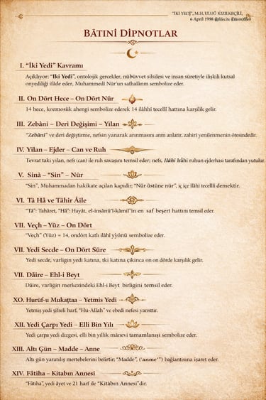 “İki yedi” ifadesi, bâtınî gelenekte 14’lü ilâhî yapıya işaret eder. Bu yapı hem ontolojik (varlık mertebeleri), hem nübüvvet–velâyet zinciri, hem de insan sûreti üzerinden okunur. İslâm irfanında bu sayı, özellikle Nûr-i Muhammedî’nin zuhur safhalarıyla ilişkilendirilir.