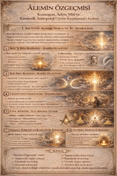 “Âlemin Özgeçmişi” başlıklı metin, sembolik ve ezoterik bir kozmogoni anlatısıdır. Düz yazı halinde değerlendirildiğinde, metnin temel iddiası şudur: Mutlak Varlık, kendi özünü seyretme arzusuyla varlık alanını açığa çıkarır. Başlangıçta hiçbir boyut ve madde yoktur; her şey saf bilinç hâlindedir. Bu bilinç, bir “nokta” şeklinde yoğunlaşır. Nokta burada hem başlangıcı hem de sınırsız potansiyeli temsil eder. Modern kozmolojideki tekillik kavramıyla sembolik bir paralellik kurulabilir; ancak metin bunu fiziksel değil metafiziksel bir başlangıç olarak ele alır.