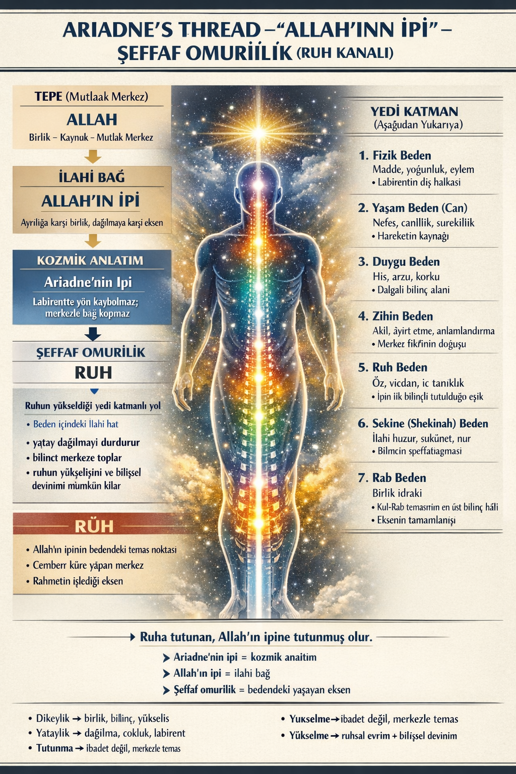 ALLAH’IN İPİ-KUNDALINI- ŞEFFAF OMURİLİK. Kundalini, klasik öğretilerde “uyuyan güç” olarak anlatılır; bu sentezde ise RÛH’un bedendeki adıdır. Allah’ın ipi, bu ruhun ilahi kaynağa bağlı eksenidir. Şeffaf omurilik, kundalininin/ruhun yükseldiği kanaldır.