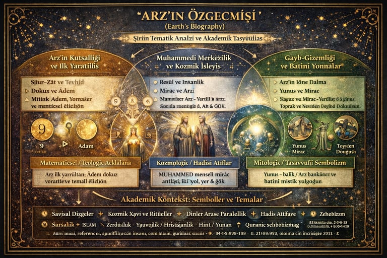 Metin, “ARZ” (yeryüzü/toprak) temasını kozmogoni + antropoloji + ritüel teori üçgeninde kuran, yoğun işârî (sembolik) / sayısal bir şiir. Düz okuma ile değil; “metnin kendi iç mantığına” göre işleyen bir kozmos-dil kuruyor. Aşağıda, metni hem içeriden (şiirin mantığı), hem dışarıdan (akademik okuma) yorumluyorum.