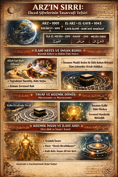 ARZ’IN SIRRI. Arapça “arz” (أرض) kelimesi üç harften oluşur: elif (ا), râ (ر) ve dad (ض). Ebced sisteminde elif 1, râ 200 ve dad 800 değerindedir. Bu harflerin toplamı 1 + 200 + 800 eder ve sonuç 1001 olur. Bu nedenle metinde “arz” kelimesinin toplamının “bin bir” ettiği belirtilir..