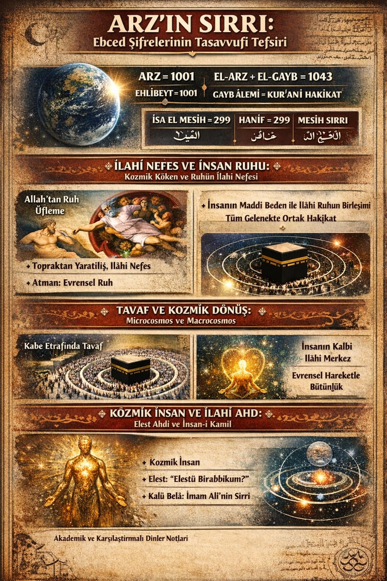 Şiirde “Arz”, yalnızca fiziksel dünya değil, ilâhî sırların tecellî ettiği bir kozmik alan olarak ele alınmaktadır. İslam düşüncesinde “arz” kavramı Kur’ân’da hem maddî dünya hem de ilâhî kudretin tecelli alanı olarak kullanılır (Bakara 2:30; Zümer 39:69). Tasavvufta ise arz çoğu zaman insanın içsel varlığıyla ilişkilendirilir. İbn Arabî’ye göre insan “küçük âlem” (mikrokozmos) olup evrenin tamamının özünü taşır. Bu anlayış, Hindu düşüncesindeki Purusha – Kozmik İnsan, Kabala’daki Adam Kadmon, ve Hermetik gelenekteki Microcosm–Macrocosm öğretisiyle benzerlik gösterir.