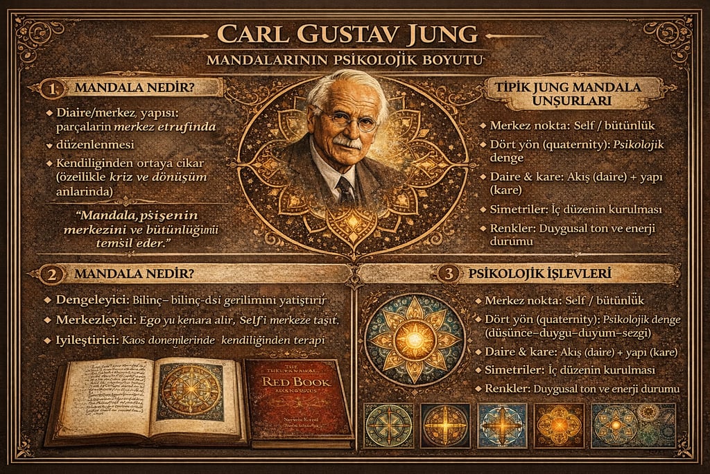 Jung için mandala, bir süsleme ya da dini motif değil; psişenin kendini düzenleme ve merkeze gelme sembolüdür. Onu “çizilen bir resim”den çok ruhun durumu olarak okur.