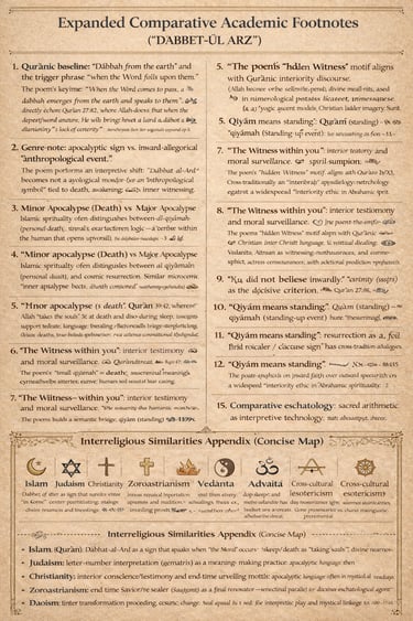 The poem’s key line (“When the Word comes to pass, a dabbah emerges from the earth and speaks to them”) directly echoes Qur’an 27:82, where Allah states that when the decree/word occurs, He will bring forth a creature from the earth to address humanity’s lack of certainty.