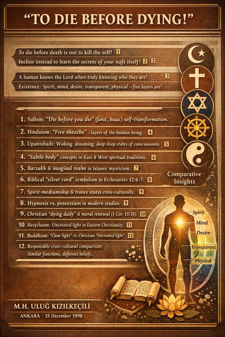 DIE BEFORE DYING. To die before death is not to kill the self! Incline instead to learn the secrets of your nafs itself! A human knows the Lord when truly knowing who they are! Existence: Spirit, mind, desire, transparent, physical — five layers are!