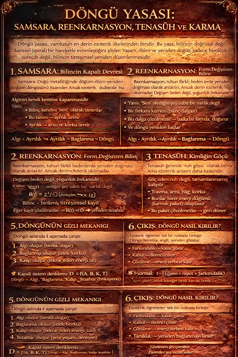Döngü yasası, varoluşun en derin ezoterik ilkelerinden biridir. Bu yasa, bilincin doğrusal değil, dairesel (spiral) bir hareketle evrimleştiğini söyler. Yaşam, ölüm ve yeniden doğuş; sadece biyolojik süreçler değil, bilincin titreşimsel yeniden düzenlenmesidir.