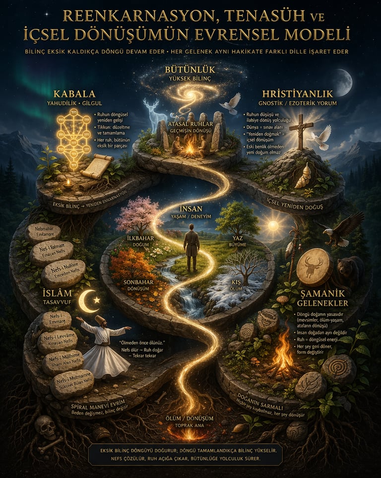 Reenkarnasyon, ruhun farklı bedenlerde yeniden doğması olarak anlatılır. Ancak derin ezoterik okumada: Değişen beden değil, yoğunluk frekansıdır.