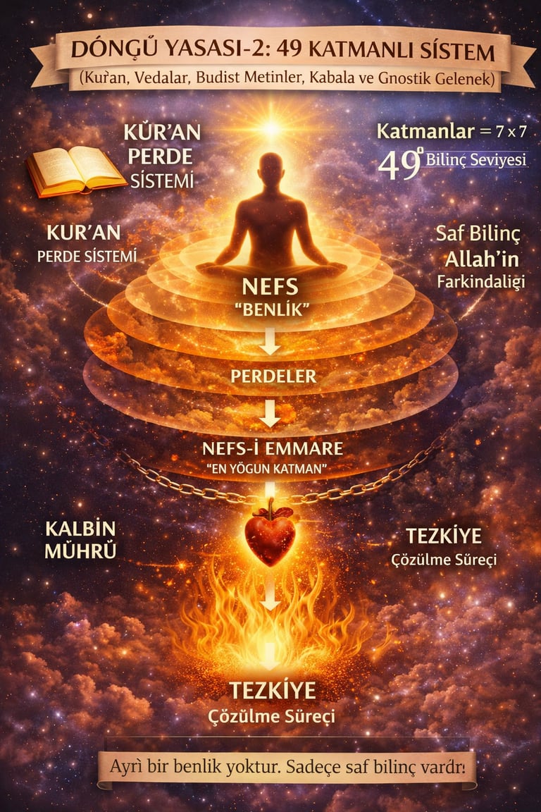 DÖNGÜ YASASI-2: 49 KATMANLI SİSTEM.Ezoterik gelenekler bu yüzden her zaman aynı şeyi vurgular: Bilmek yetmez. Görmek gerekir. Ve görmek, ancak doğrudan deneyimle mümkündür. Bilinç kendini ayırır → kendini deneyimler → kendini fark eder → kendine geri döner.