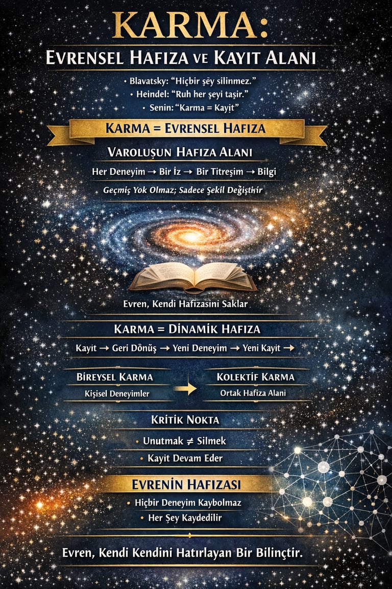 Karma, bu sistemin denge mekanizmasıdır. Her hareket, her niyet, her deneyim bir iz bırakır ve bu izler denge kurulana kadar geri döner.