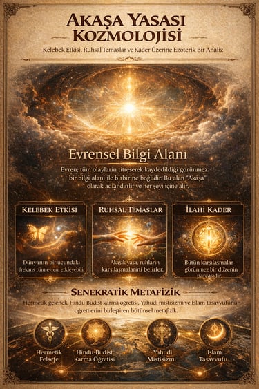 Bu çalışma, Akaşik Yasa olarak adlandırılan metafizik kozmoloji modelini incelemektedir. Metinde yer alan kelebek etkisi, kader ve ruhsal karşılaşmalar kavramları; Hermetik felsefe, İslam düşüncesi, Hindu-Budist karma öğretisi ve modern kaos teorisi bağlamında karşılaştırmalı olarak ele alınmaktadır. Akaşik yaklaşım, evreni bütünsel bir bilgi alanı olarak yorumlayan modern ezoterik geleneklerin sentezini temsil etmektedir.
