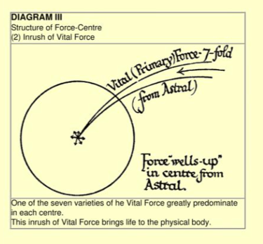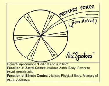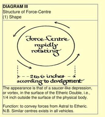 Prana, her çakranın merkezine, o çakranın düzlemine dik olarak akar; belki de "ışınlama" daha uygun bir terimdir, çünkü bu güç astral düzlemden eterik düzleme gelir. Çakranın merkezinden, güç daha sonra köken yönüne dik olarak, yani Eterik İkili düzleminde, bir dizi yönde ve düz çizgiler halinde yayılır. Bir tekerleğin kollarına benzer şekilde, yön sayısı her çakrada değişir....