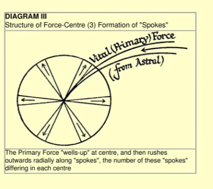 Birincil Güç merkezden "yayılır" ve daha sonra her çakrada sayısı değişen "kollar" boyunca radyal olarak dışarı doğru akar.
