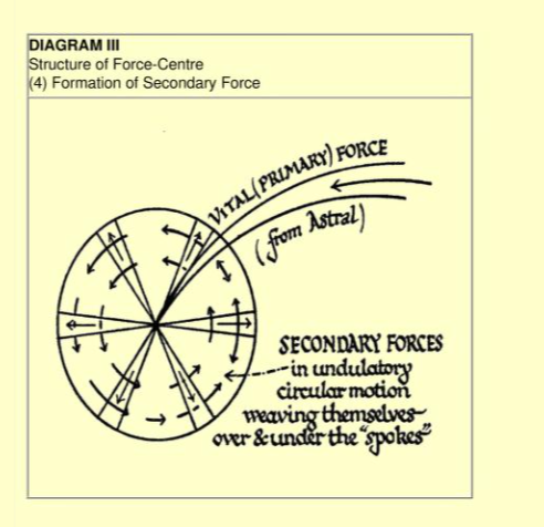 Tıpkı bir manyetik plakanın bir tel bobinine yerleştirilmesinin, telde mıknatısın eksenine dik bir elektrik akımı oluşturması gibi, çakraya giren Prana'nın birincil kuvveti de çakranın yüzeyinde ikincil bir kuvvet oluşturur. Bu ikincil kuvvet, tıpkı yuvarlak bir sepetin dibindeki maddenin merkezden yayılan kaburgaların üstünden ve altından geçmesi gibi, kolların üstünden ve altından geçerek çakrayı çevreler.