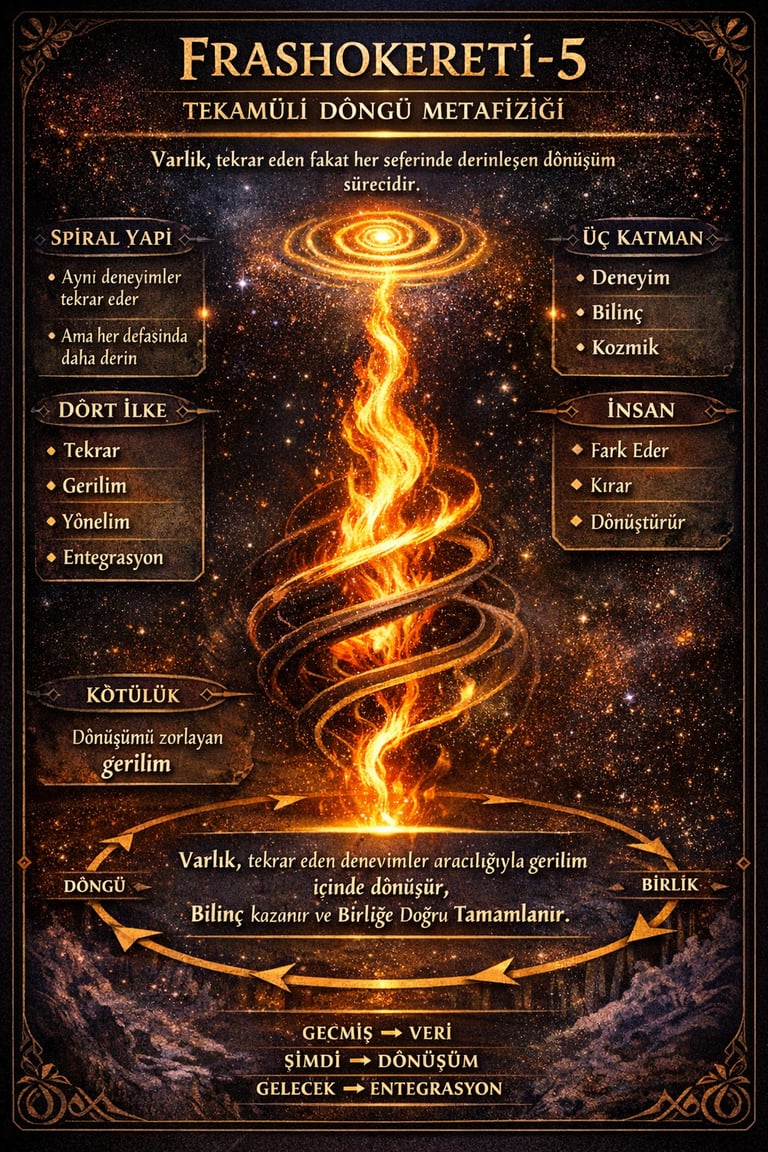 FRASHOKERETİ-5: TEKAMÜL DÖNGÜ METAFİZİĞİ.Bilgi, tekrar eden deneyimlerin fark edilmesidir. Bilgelik ise bu tekrarların yönünü değiştirebilme yetisidir. İnsan, ancak farkındalık kazandığında döngünün dışına çıkabilir ve onu dönüştürebilir. Zaman bu sistemde doğrusal değil, spiral bir akıştır.