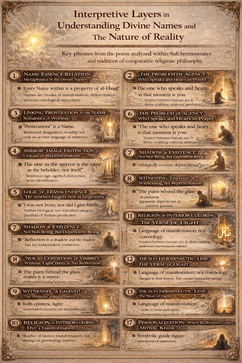 The statement “Every Name within is a property of al-Haqq” establishes an ontology of Divine Names in which existence is read on the plane of names/manifestations. A Name here is not mere designation but a mode of manifestation. The distinction between “essence” (dhāt) and “name” (attributes/acts of manifestation) structurally parallels the “transcendent essence–immanent appearance” distinction found in various traditions.