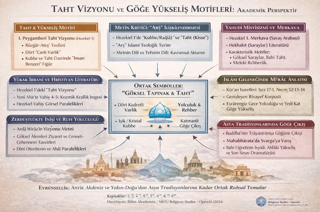 Dinler tarihi literatürü, bu iki damarın (taht vizyonu + yükseliş yolculuğu) antik Akdeniz ve Yakın Doğu’da birbirine yakınlaştığı geniş bir “göksel tapınak/taht” imge havuzu olduğunu gösterir.³