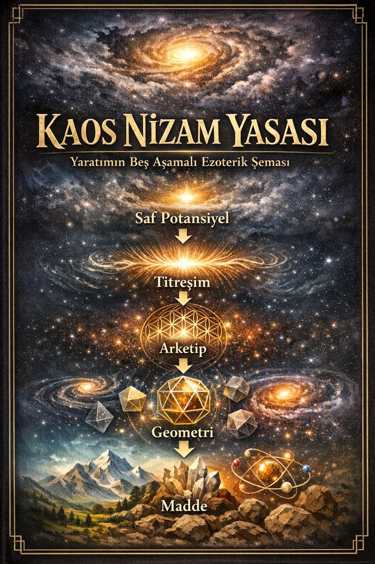 Kaos-Nizam Yasası-1. Kaos → Arketip → Fizik Bu sistem şu şekilde çalışır: Kaos (Potansiyel Alan) ↓ Titreşimsel ayrışma ↓ Arketip (Form Şablonu) ↓ Enerji yoğunlaşması ↓ Fizikî yapı (Madde ve kanun)