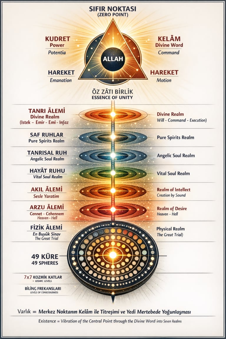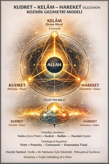 Sıfır noktası, yani merkez; kudret, kelâm ve hareket olarak ifade edilen üçlü yapıyla açıklanır. Bu üçlü, tek bir hakikatin üç ayrı yönü gibi okunabilir. Kudret, varlığın potansiyel hâlini ve henüz açığa çıkmamış gücünü temsil eder. Kelâm, yaratıcı emrin ortaya çıkışı, yani ilk titreşimsel başlangıçtır. Hareket ise bu titreşimin tecelliye dönüşmesi, noktanın açılarak âlemleri doğurması anlamına gelir.