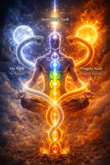İnsan bedeninde sağ, sol ve orta olmak üzere üç ana enerji kanalı bulunduğu anlatılır. Bu kanallar, yalnızca fiziksel bir yapıdan ziyade, varlığın içsel dengesini sembolleştiren ince yollar olarak tasvir edilir. Sol kanal — İda Nadi — “Ay Kanalı” diye anılır; dişil titreşimi, sezgiyi ve içe dönüşü temsil eder. Kalbin sol-orta hatta yer alması, bu anlatımda yalnızca biyolojik bir gerçeklik değil; aynı zamanda şefkat ve alıcılık ilkesinin sembolik bir yansımasıdır.