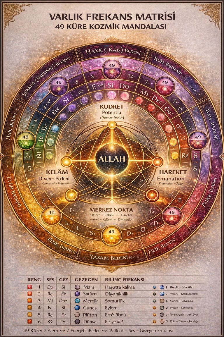 Her âlem yedi alt titreşime ayrılır ve toplamda kırk dokuz küre oluşur. Küre bilinç frekansını, daire titreşim yolunu, nokta ise merkezi simgeler. Bu yapı bir iniş hiyerarşisi değil, eşzamanlı bir titreşim matrisi olarak okunur. Fizik âlem merkezden kopuk değildir; merkezin yoğunlaşmış hâlidir. Kozmik mertebeler ile insanın içsel katmanları aynı titreşim ölçeğinde değerlendirilir.
