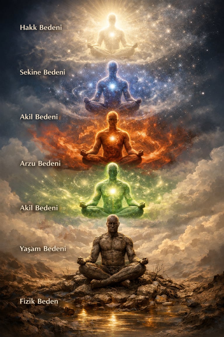 Böylece insan, yalnızca tek bir bedene değil; iç içe geçmiş bir evrene doğar. Çekirdekte saklı Hakk, dışta deneyimleyen nefs ile birlikte yol alır. Ve her adımda, dış katmanların gürültüsünden içteki özün sessizliğine doğru bir çağrı vardır.