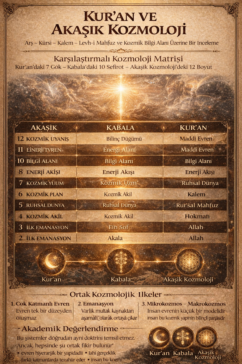 Bu çalışma, Kur’an’daki kozmolojik kavramlar ile Akaşik model arasındaki olası metafizik paralellikleri incelemektedir.