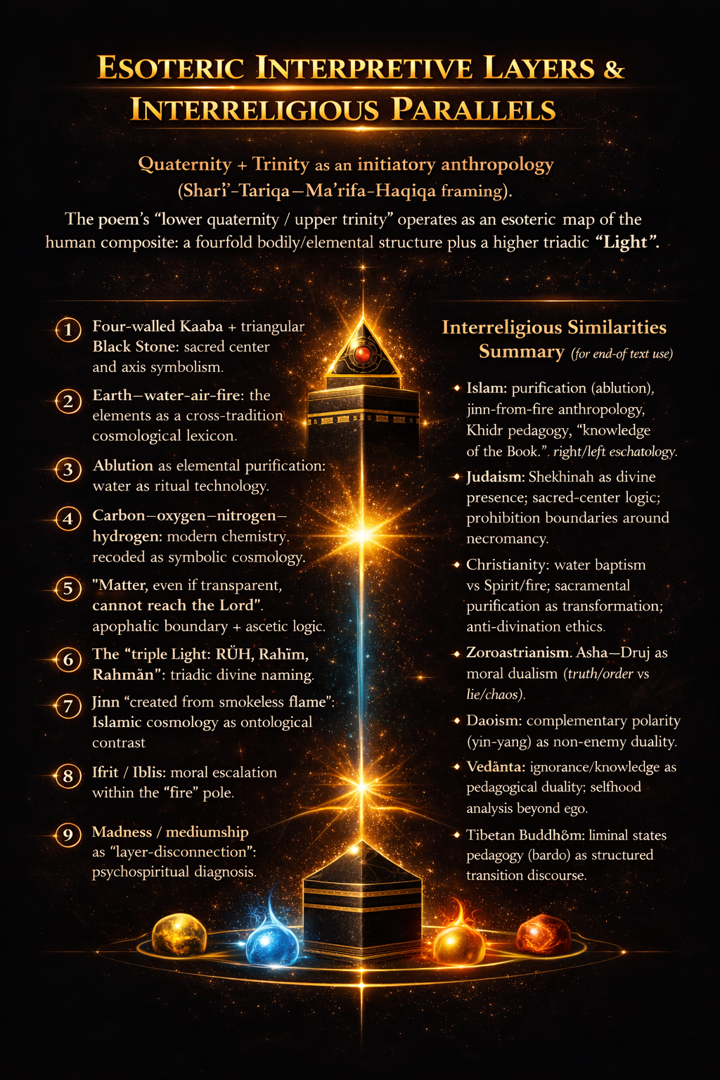 2) “Four-walled Kaaba” + “triangular black stone”: sacred center and axis symbolism.
