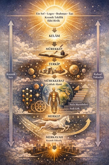 Merkavah, merkep, mürekkep, terkip ve mürekkebat kavramları bu sürecin farklı aşamalarını sembolik biçimde temsil edebilir. Bu kavramlar birlikte okunduğunda, kozmik iniş ve yükselişin metafizik haritası ortaya çıkar.