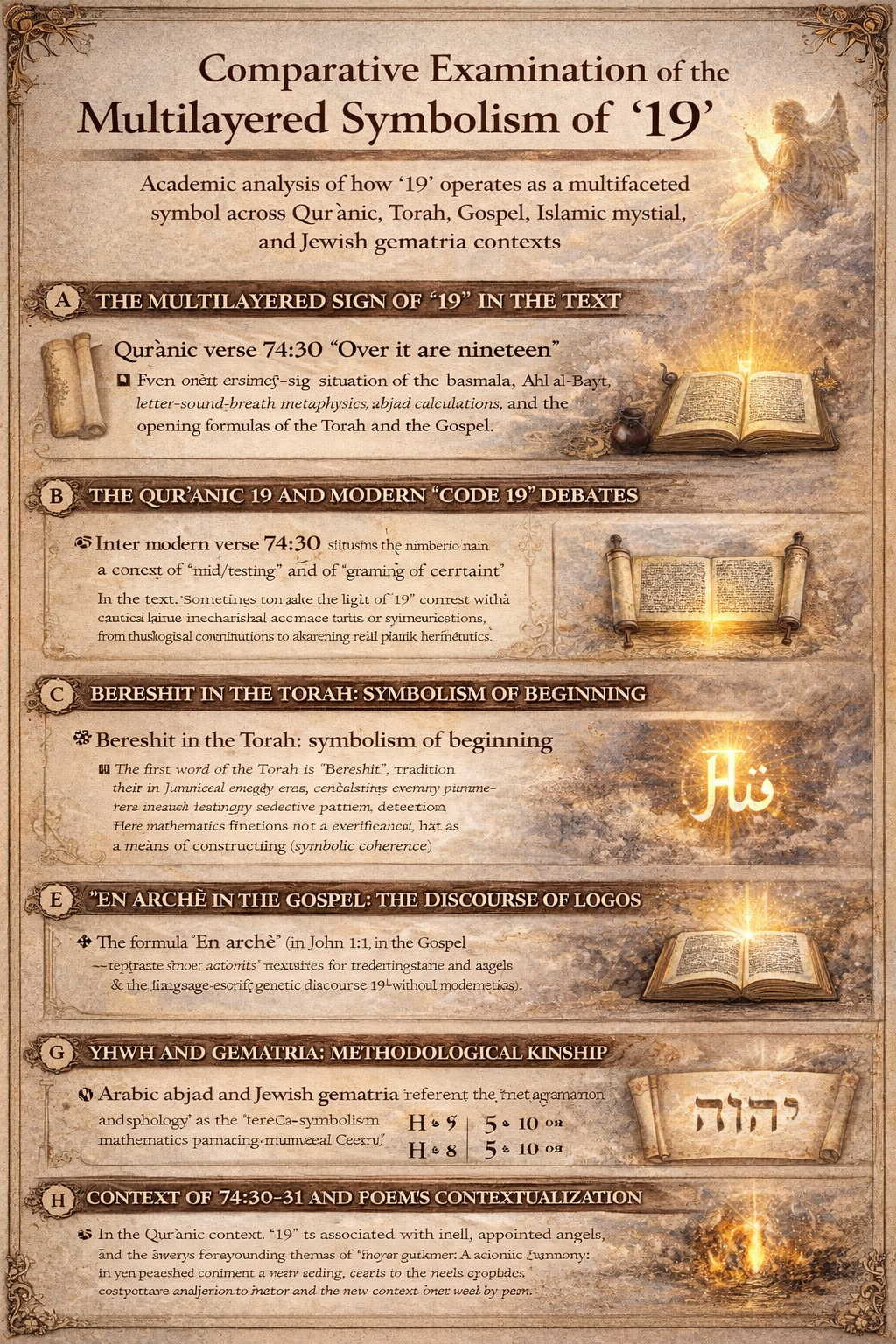 In this text, “nineteen” functions as a sign that cannot be reduced to a single meaning. On the one hand, it draws upon the Qur’anic statement “Over it are nineteen” (74:30); on the other, it expands through parallels established among the components of the basmala, the emphasis on the Ahl al-Bayt, the metaphysics of letter-sound-breath (“H,” “Hū,” “Hi”), abjad calculations, and the opening formulas of the Torah and the Gospel. Thus, 19 ceases to be merely a number and becomes an “engine of meaning production” within the text.