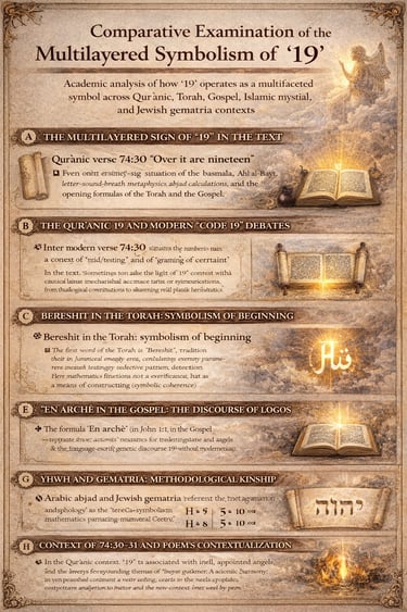 The poem’s approach touches upon modern claims that read 19 as a numerical code. Within that line, criticisms frequently arise concerning counting parameters, textual variants, selective pattern detection, and statistical coincidence. From the perspective of comparative religion, a more productive path is to approach such claims not through the logic of “absolute proof,” but as a form of “symbolic hermeneutics”—a technique of meaning production.