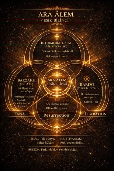 4) “Ara-âlem” fikri: Barzakh (İslam) – Intermediate State (Hristiyanlık) – Bardo (Tibet Budizmi)