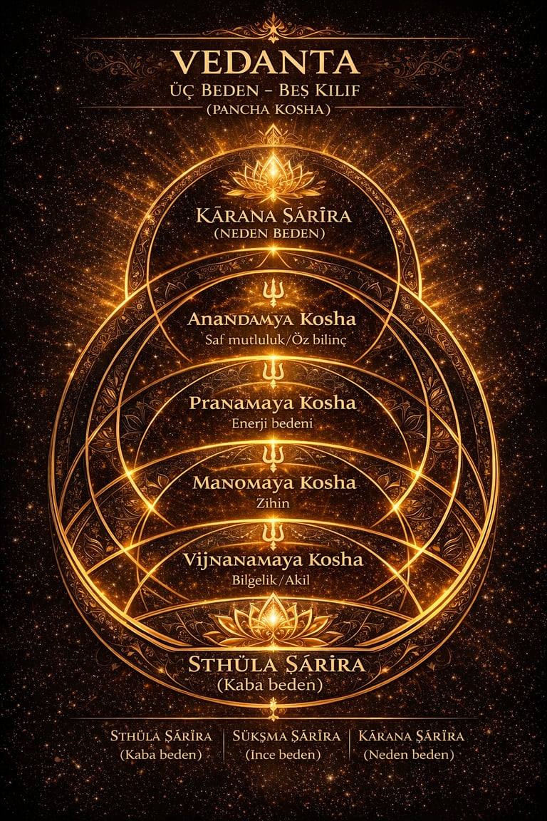 Dipnot 12. Vedanta’da “üç beden + ince bedenin bileşenleri”ni özetleyen doküman örneği: Vedanta-Concepts PDF.
