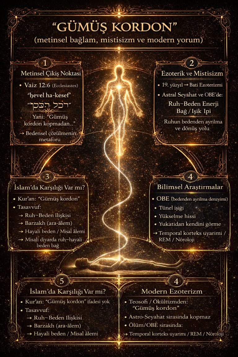 Şiirdeki “kordon” imgesi, modern ezoterik literatürde “silver cord” diye bilinen motifi çağrıştırır. Bu motifin en meşhur metinsel dayanaklarından biri Vaiz/Ecclesiastes 12:6’dır; ancak akademik/klasik yorumlarda bu “kordon” çoğunlukla bedensel çözülme ve ölümün biyolojik metaforu olarak anlaşılır (ör. omurilik/sinir sistemi benzetmeleri gibi).⁸ Şiir ise bunu “şeffaf bedenle bağlılık” şeklinde ontolojik bir bağ gibi yeniden kuruyor.
