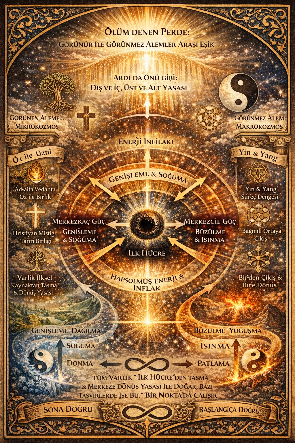 Şair, kozmik süreci sıcaklık-soğukluk, açılma-büzülme çiftleriyle okur. Taoizm’de yin-yang, birbirini dışlayan değil, birbirini doğuran ve dengeleyen karşıt fazlardır. Budizm’de ise oluş, bağımlı ortaya çıkış zinciri içinde kavranır; yani şeyler kendi başlarına sabit özler değil, şartlı süreçlerdir. Şiirdeki soğuma ve büzülme de “cevher”den çok “süreç” fikrini öne çıkarır.