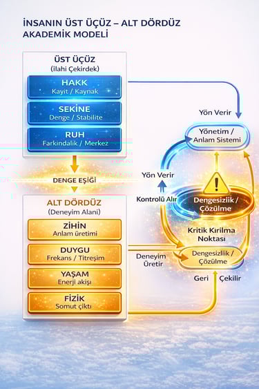 Bu yüzden üst üçüz ile alt dördüz arasındaki denge, insan olmanın temel şartıdır. Alt dördüz deneyim üretir, üst üçüz bu deneyimi anlamlandırır. Biri olmadan diğeri eksiktir. Ancak biri diğerinin yerini aldığında sistem bozulur.