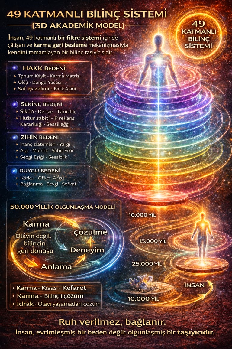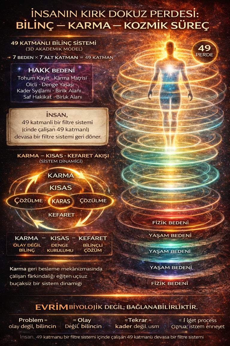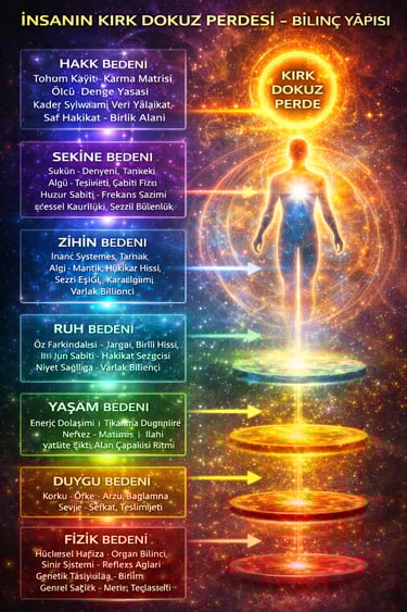 7. İnsan, yedi ana bedenden oluşan bir bilinç organizmasıdır; ancak bu yapı yalnızca yedi katmanla sınırlı değildir. Her beden kendi içinde yedi alt perde taşır ve böylece toplamda kırk dokuz katmanlı bir algı ve işleyiş sistemi ortaya çıkar. Bu kırk dokuz perde, hakikati engelleyen yapılar değil; hakikatin doğrudan taşınamayacak yoğunluğunu süzerek deneyimlenebilir hale getiren filtrelerdir. İnsan hakikati görmez; hakikatin bu kırk dokuz farklı kırılımını yaşar.