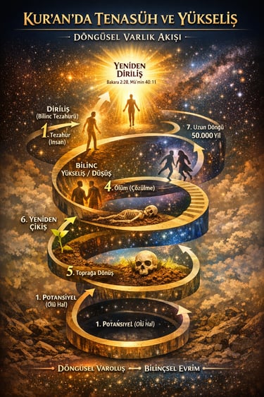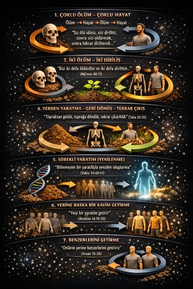 Bakara 2:28 ile birlikte döngü ilk kez açık biçimde görülür: ölü hâl → diriliş → ölüm → yeniden diriliş. Varlık artık lineer değil, tekrar eden bir süreç olarak anlaşılmaya başlanır.