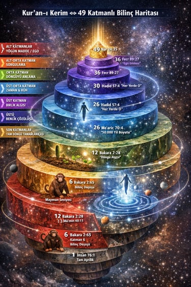 Kur’an-ı Kerim bağlamında bu katmanlar, bilincin artık yalnızca döngüyü fark etmekle kalmayıp onu işleyen bir sistem olarak kavradığı aşamayı temsil eder. Önceki seviyelerde görülen döngü, burada zihinsel bir fikir olmaktan çıkar ve doğrudan algılanan bir gerçekliğe dönüşür.