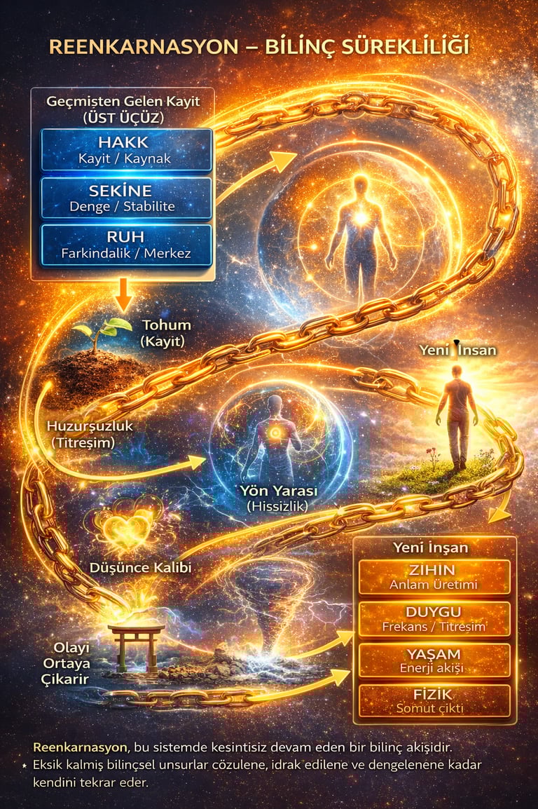 4. Reenkarnasyon, bu sistem içinde basit bir yeniden doğuş değil; bilinç sürekliliğinin insan formu üzerinden devam etmesidir. İnsan olarak ölüp yine insan olarak doğmak, yalnızca biyolojik bir tekrar değil, üst üçüzün tamamen kopmamış olduğunun göstergesidir. Hakk beden kayıtları taşımaya devam eder, sekine bu kayıtların dengesini korur ve ruh beden merkezde kalarak insan formunun çekirdeğini ayakta tutar. Bu nedenle yeniden doğan şey kişi değil, kesintiye uğramamış bilinç akışıdır.