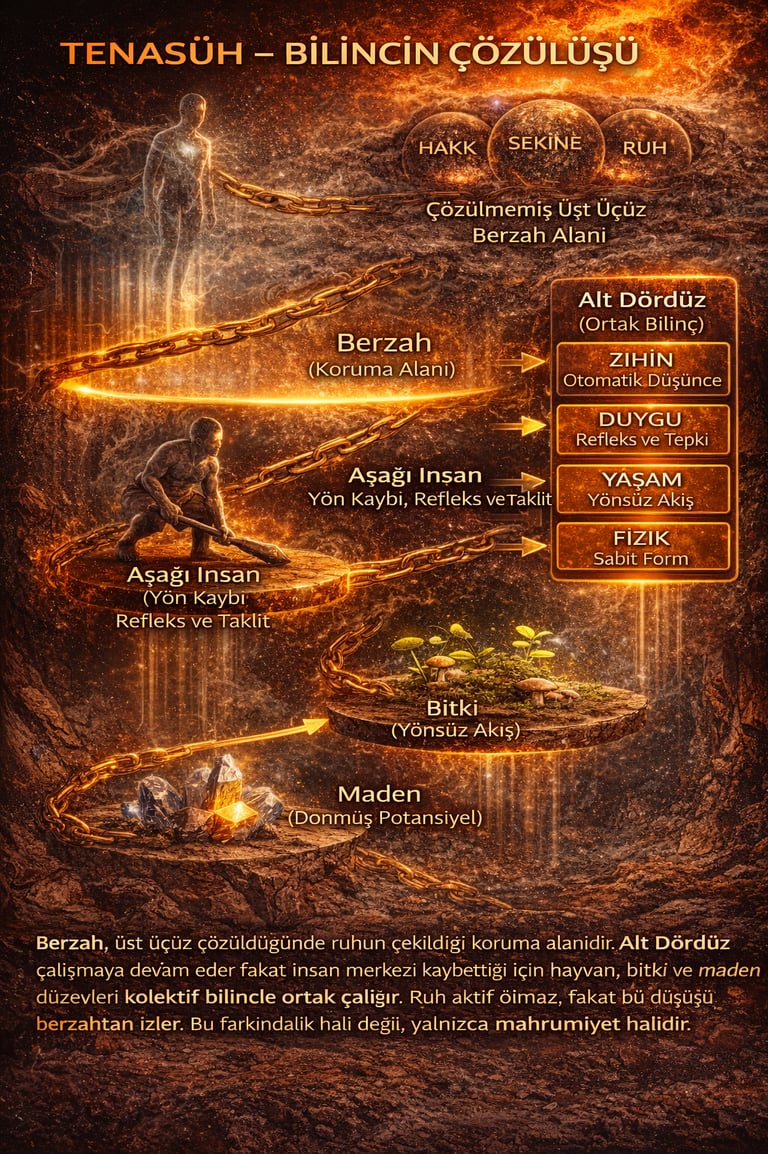 Tenasüh bu nedenle bir ceza değil; bir geri çekilme mekanizmasıdır. Bilinç, taşıyamadığı yoğunlukta kalamaz. Sistem, dağılmayı önlemek için varlığı daha basit bir işleyiş düzeyine indirir. Bu bir yok oluş değil; askıya alınmış bir bilinç halidir.
