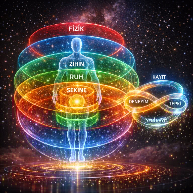 1. İnsan, tek katmanlı bir canlı değil; birbirine bağlı yedi enerji ve bilinç katmanından oluşan bir organizmadır. Fizik beden bu yapının yalnızca görünen yüzüdür. Onun ardında yaşam akışı, duygu, zihin, ruh, sekine ve Hakk alanları yer alır. Bu nedenle insanın yaşadığı hiçbir olay yalnızca fizik düzlemde açıklanamaz. Görünen her sonuç, görünmeyen katmanlarda oluşmuş bir kaydın son halkasıdır. Olay, başlangıç değil; sürecin en son görünür aşamasıdır.