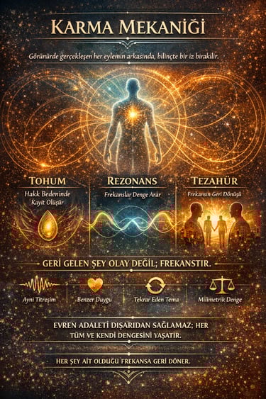 Evrenin işleyişi rastgele değildir. O, rezonans temelli bir denge mekanizmasıyla çalışır. Yani varlık ne üretmişse, aynı frekansta karşılığını alır. Bu karşılık birebir kopya olmak zorunda değildir; fakat öz olarak aynıdır. Bu yüzden aynı tema, farklı olaylar içinde tekrar eder.