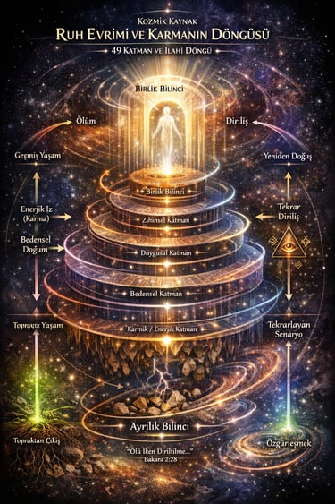 Bu akış, Kur’an-ı Kerim – Bakara 2:28 ve Mü’min 40:11 ayetlerinde sembolik olarak görülür.