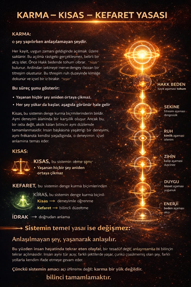 Kısas, bu sistemin denge kurma biçimlerinden biridir. Aynı deneyim alanında bir karşılık oluşur. Ancak bu, bir ceza değil; eksik kalan bilincin aynı düzlemde tamamlanmasıdır. İnsan başkasına yaşattığı bir deneyimi, aynı frekansta kendisi yaşadığında, o deneyimin içsel anlamına temas eder.