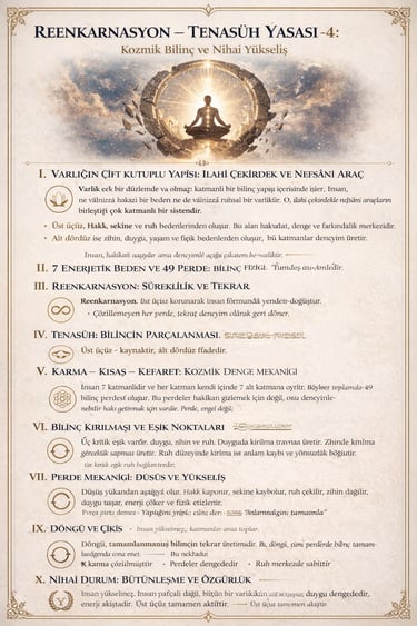 REENKARNASYON – TENASÜH YASASI-4: Kozmik Bilinç ve Nihai Yükseliş.Yükseliş süreci: Maden → Bitki → Hayvan → İnsan (üst üçüz bağlanır) Düşüş süreci: İnsan → (tenasüh) → Alt formlar → yeniden hazırlık → tekrar insan Bu döngü, bilinç tamamlanana kadar devam eder.