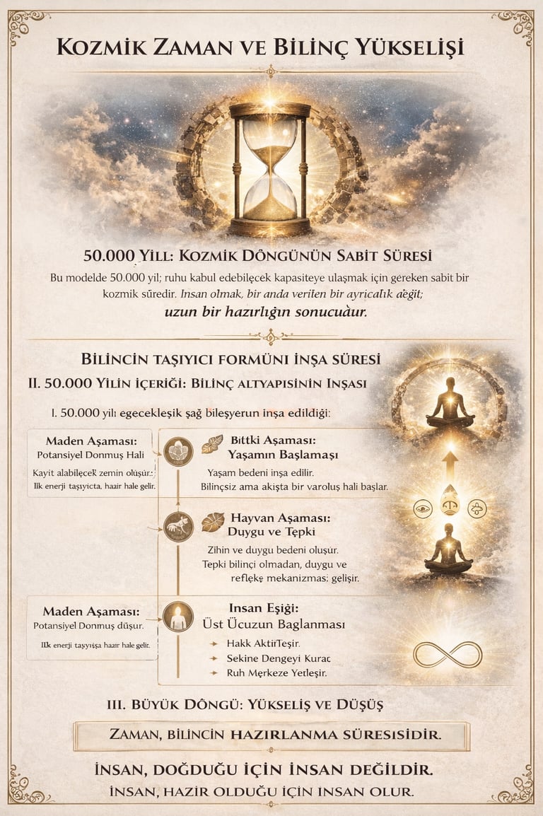 Bu modelde 50.000 yıl, sembolik bir ifade değil; maden konumundan insan konumuna yükseliş için gereken sabit bir kozmik süredir. Bu süre, bilinç taşıyıcısının ruhu kabul edebilecek kapasiteye ulaşması için gerekli olgunlaşma periyodunu temsil eder.