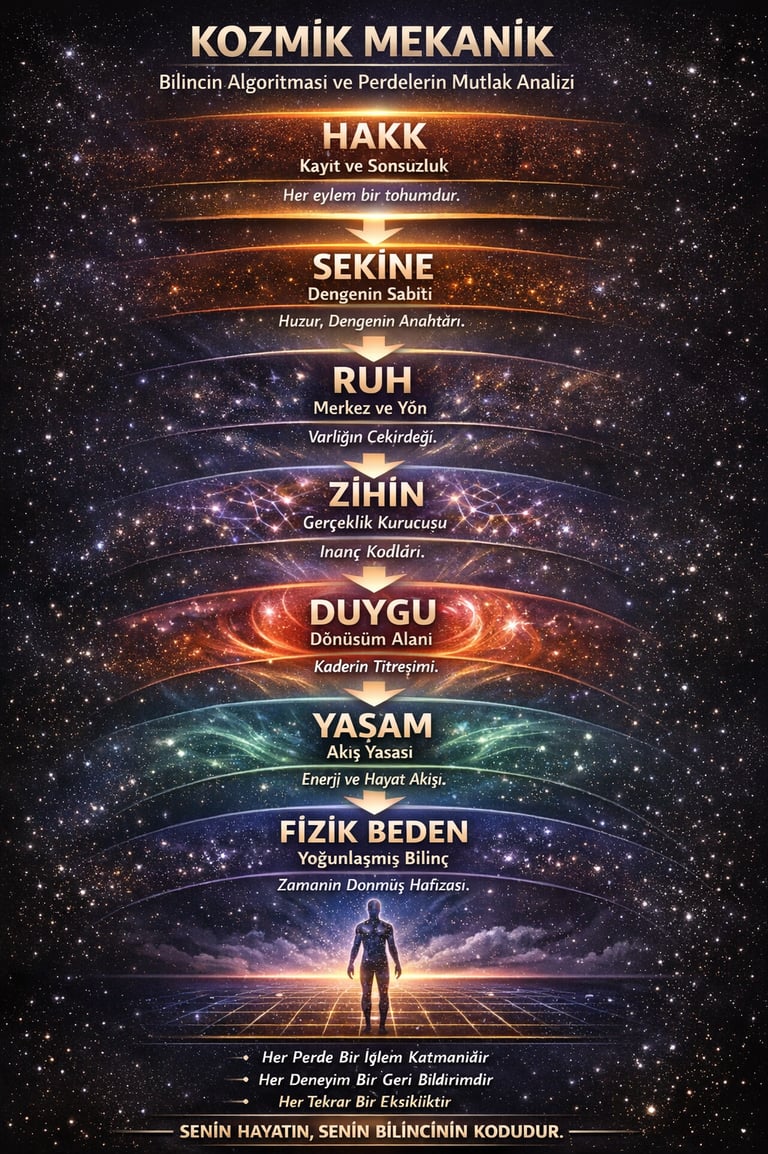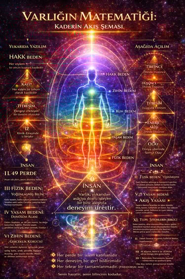 Varlık, yukarıdan aşağıya doğru işleyen bir bilinç akışıyla deneyim üretir. Bu akış Hakk bedeninde başlar; burada her eylem bir tohum olarak kaydedilir. Bu kayıt sekineye iner ve dengeyi etkileyen bir titreşim oluşturur. Ardından ruha ulaşır ve kimlik düzeyinde iz bırakır. Bu iz zihinde düşünceye, duyguda titreşime, yaşam bedeninde enerji akışına ve en sonunda fizik dünyada somut olaya dönüşür.